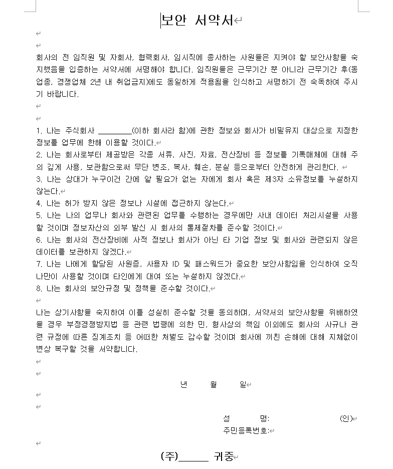 ✔️(한글) 보안 서약서 양식 무료 다운로드